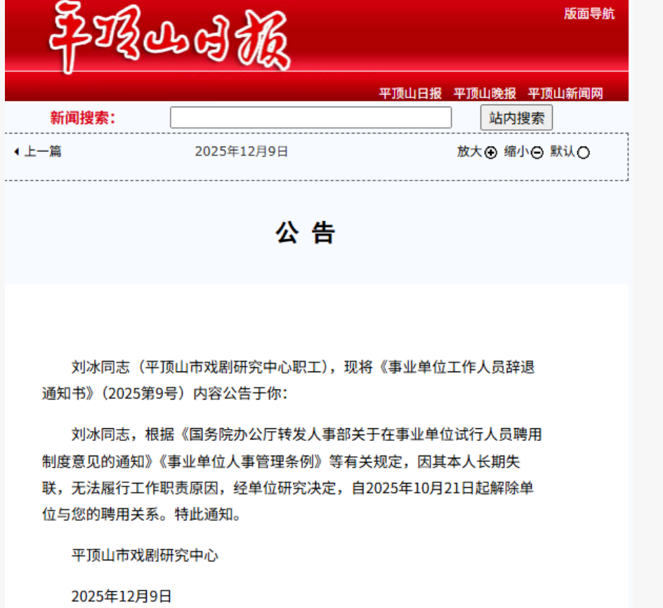 事业单位公告:刘冰同志长期失联、无法履职,解聘 河南平顶山市戏剧研究中心近日在《平顶山日报》发布辞退公告称,刘冰同志(平顶山市戏剧研究中心职工)长期失联、无法履职,...[详细]