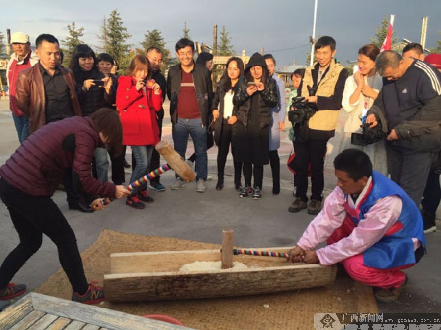 记者团一行现场体验朝鲜族打糕制作工艺。 广西新闻网记者 王莹摄