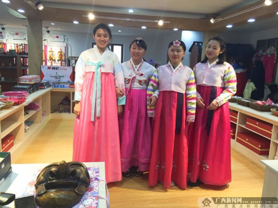 记者团一行穿上朝鲜族传统服装体验朝族风情。 广西新闻网记者 王莹摄
