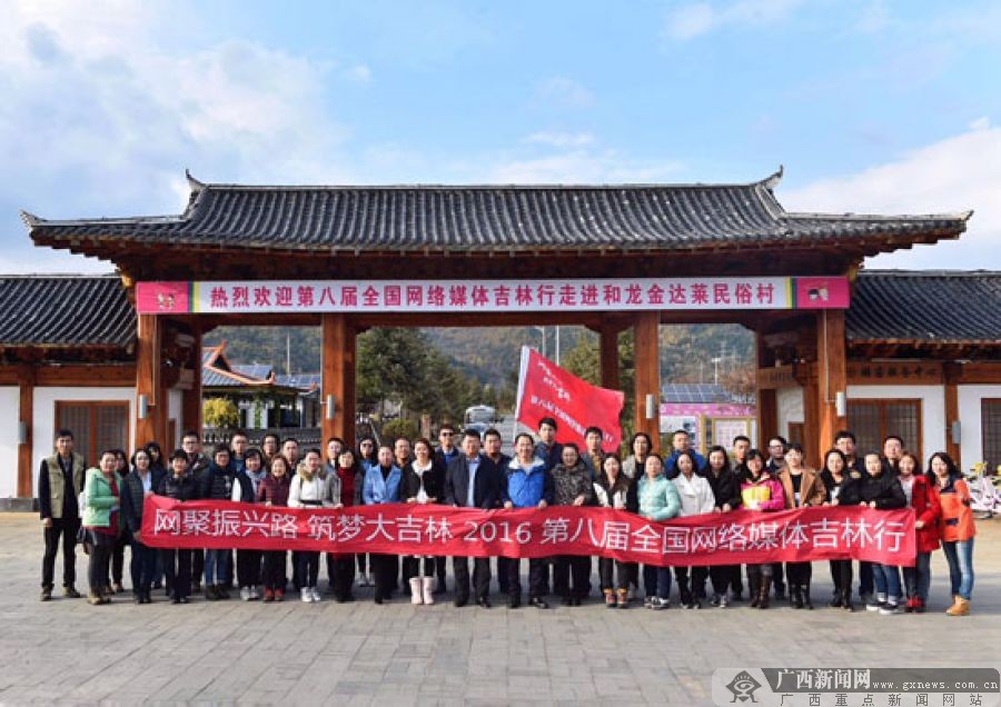 记者团一行在金达莱民俗村前合影留念。 中国吉林网供图