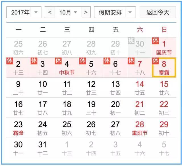 根据2017年中秋节、国庆节放假安排,10月1日(星期日)至10月8日(星期日)放假调休,共8天。9月30日(星期六)上班。根据铁路提前30天购票的规定,国庆长假期间的所有火车票现在都可以预订了。