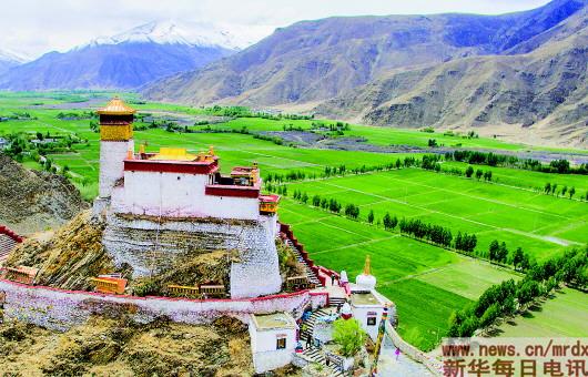 西藏第一座宫殿雍布拉康与西藏第一块农田。新华社记者刘东君摄