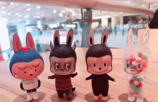 每个“宝宝”的长相都不一样。同款相似的样貌下,如果细心观察,每只都有自己的特点。以拉布布迷你二代系列为例,不变的是长长的耳朵和露出嘴外尖细的牙齿,在这之外,通体金色拉布布叫做“金闪”,它的眼睛直视着前方,而通体黑色的“黑闪”眼睛则朝右下角看。还有的娃娃在设计上有巧思,“比如拉布布二代小隐藏,头上会多有一只犄角,还有一只小尾巴。”