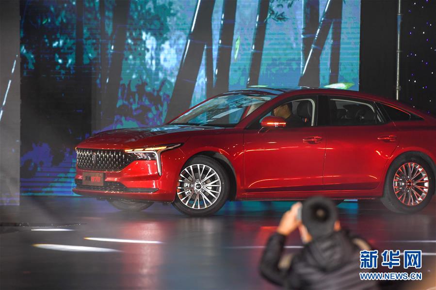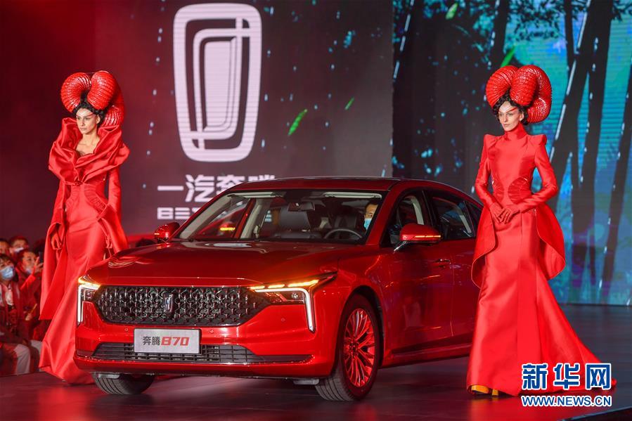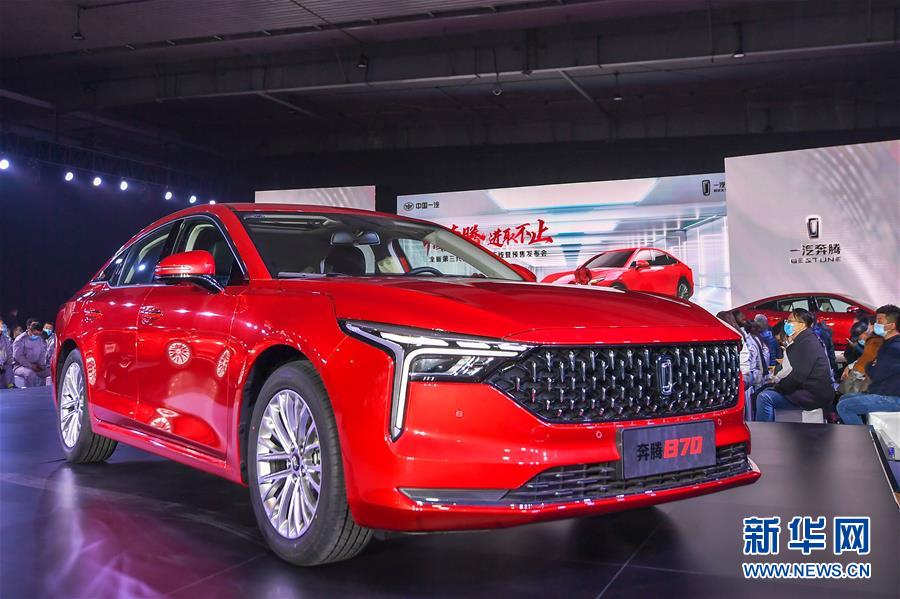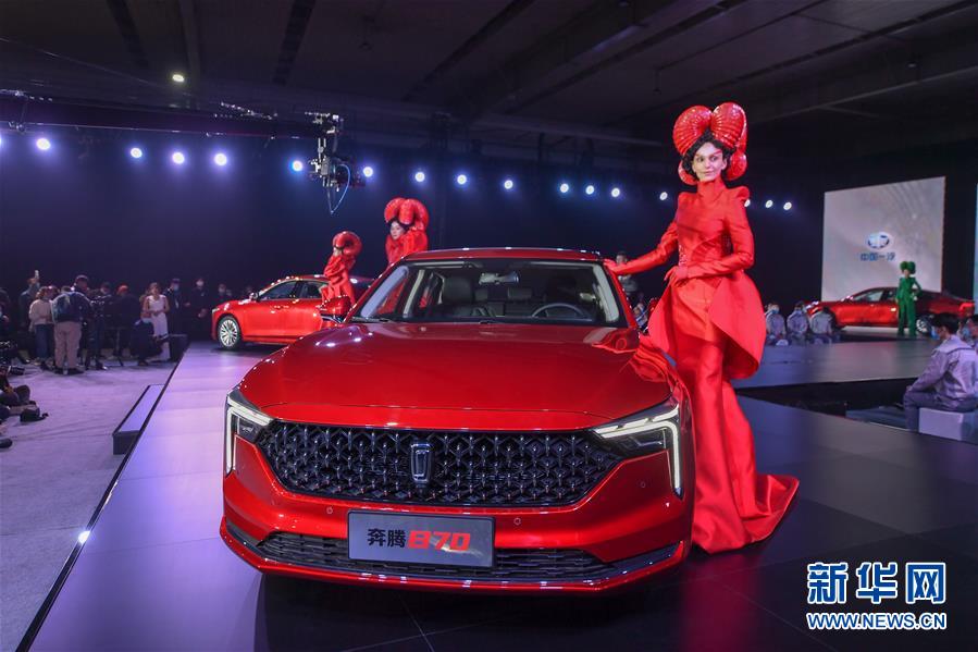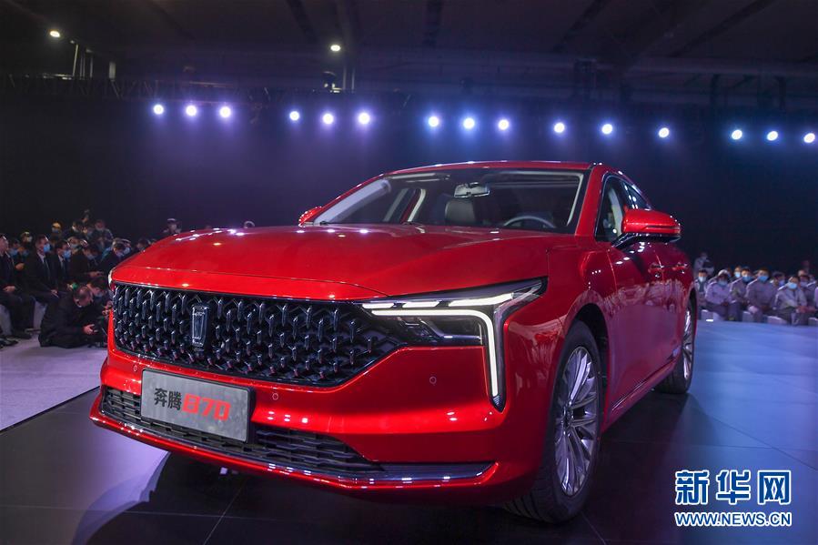 发布会现场展示的全新第三代奔腾B70轿车(11月10日摄)。 11月10日,全新第三代奔腾B70轿车下线暨预售发布会在吉林长春举行。据了解,全新第三代奔腾B70轿车搭载1.5T发动机,预售价格为10.99万元-14.99万元。 新华社记者 张楠 摄