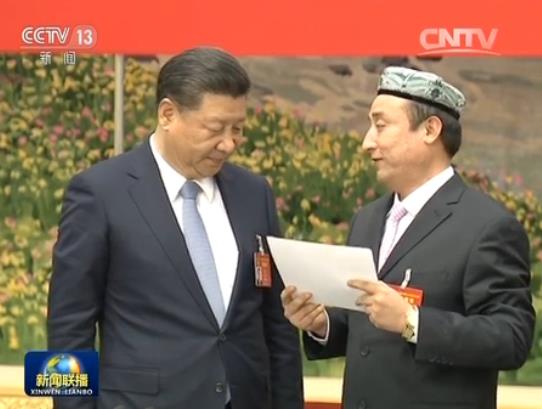 代表:我还要汇报一个事,我今天太激动了。1958年,库尔班大叔来到北京见到了毛主席,我今天见到了习主席。