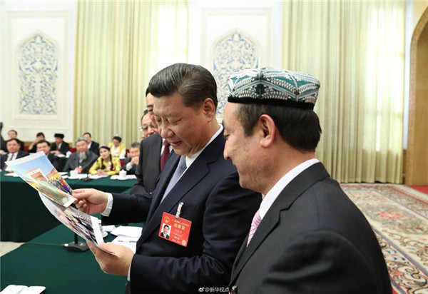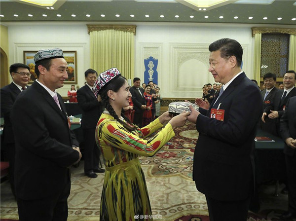 10日上午,习近平总书记参加新疆维吾尔自治区代表团审议。热汗古丽·依米尔代表和买买提依布热依木·买买提明代表向习近平敬献一顶花帽,表达新疆各族人民对总书记最崇高的敬意、最美好的祝福。习近平请他们转达对新疆各族人民的良好祝愿。