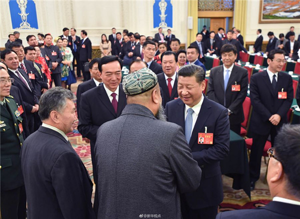 习近平向买买提依布热依木·买买提明代表了解他们村里每家有多少土地、是种粮食还是种果树,问他家里有没有认亲结对子,效果怎么样?习近平说,这项工作要扎实开展,让结对认亲取得实效。买买提依布热依木·买买提明说:“党的政策亚克西!”总书记也回应:亚克西!(文字/新华社记者霍小光,摄影/新华社记者兰红光、马占成、李涛)(据“新华视点”微博报道)
