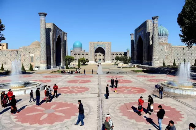 习近平还参观了位于撒马尔罕市中心的列吉斯坦广场建筑群。这里曾是古丝绸之路上闻名遐迩的集市,一时商贾云集、文化交融。参观时,手工匠向习近平赠送他们耗时8个月特意织就的丝毯。习近平表示感谢:一针一线都体现出你们对中国人民的深情厚谊。