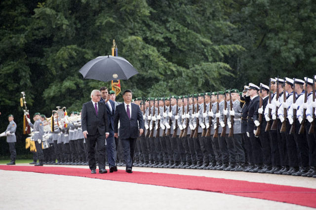 位于施普雷河畔的总统府内,礼兵列队,军乐高奏。德国总统施泰因迈尔举行隆重欢迎仪式和盛大宴会,欢迎习近平主席的到来。习近平主席是施泰因迈尔总统上任百日接待的首位外国元首。