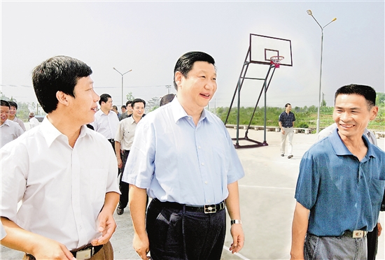 2005年6月17日,习近平在武义县调研基层民主法治并到履坦镇杨岸村察看群众性文体活动。 记者 周咏南 摄