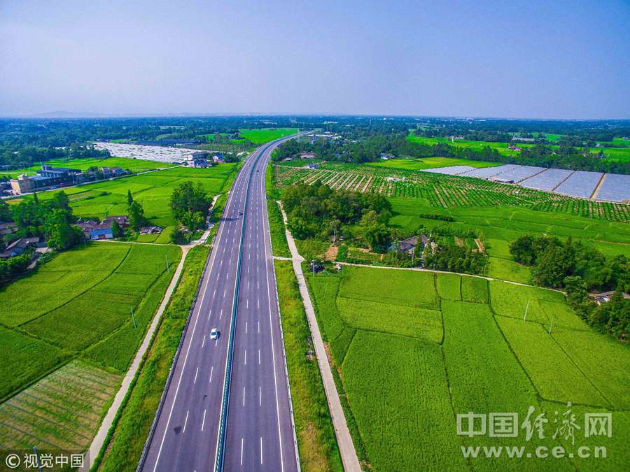 2017年7月28日,在四川省成都市邛崃,成温邛公路两侧为稻田覆盖,景色宜人。稻田中四川土楼风景如画卷般美丽。这条公路被称为“最美”公路。图片作者:文山