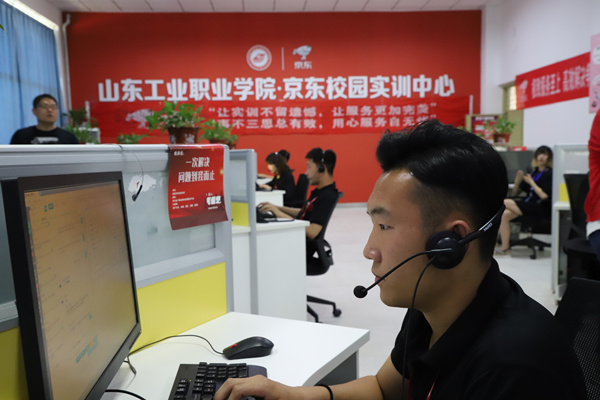 在采访过程中,“山东工业职业学院·京东校园实训中心"引起了记者的关注,在这里66名学生面前一台电脑、一部话机承担着京东客服员的角色。