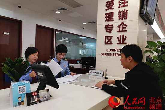 北京市西城区开设企业新设专区、变更专区、注销专区,新设企业全程电子化率达到100%,平均执照办理时长0.96小时。人民网鲍聪颖 摄