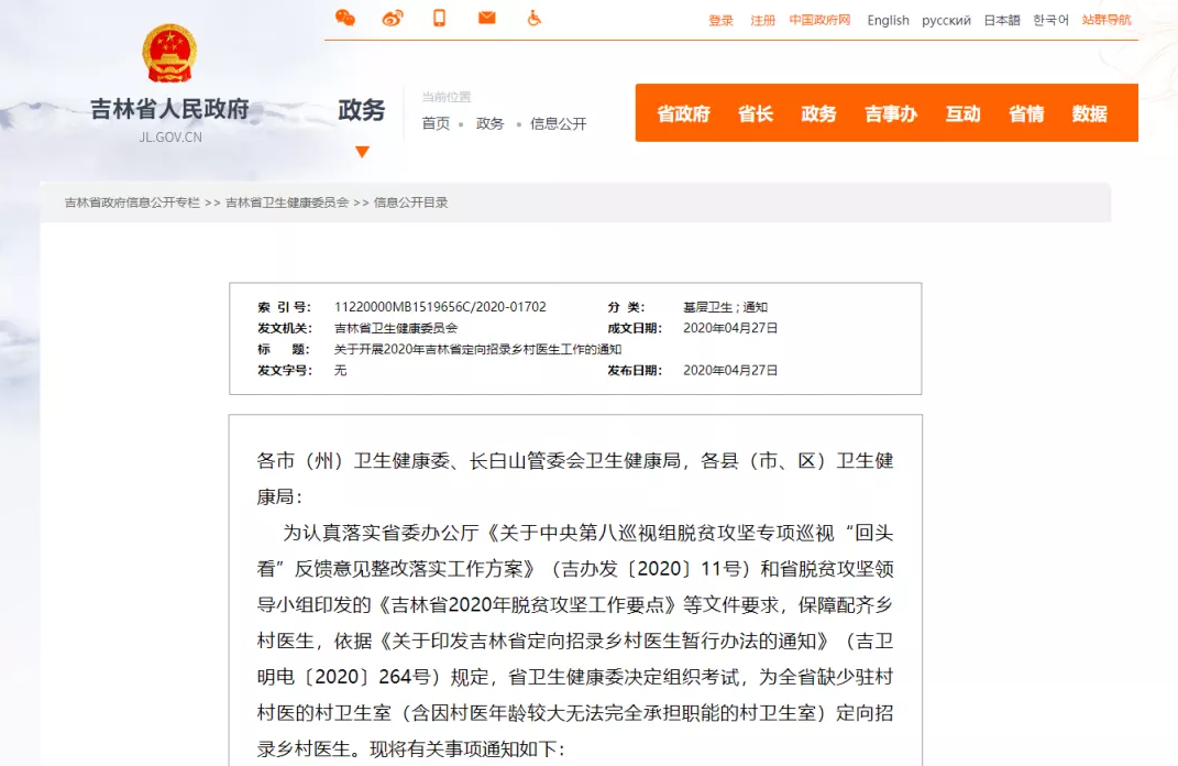 关于开展2020年吉林省定向招录乡村医生工作的通知