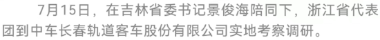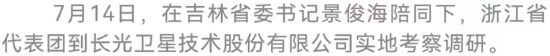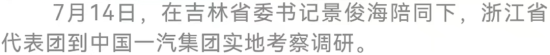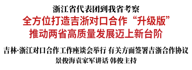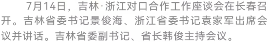 7月14日至15日,浙江省委书记袁家军率领浙江省代表团在我省考察。7月14日,双方举行吉林·浙江对口合作工作座谈会,有关方面签署11项吉浙合作协议。吉林省委书记景俊海、浙江省委书记袁家军出席会议并讲话。吉林省委副书记、省长韩俊主持会议。