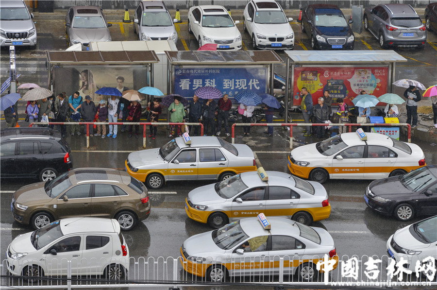 一天大雨,公交站台的市民们打伞排队等待公交车进站,在长春街头这样排队上车的场景比比皆是。