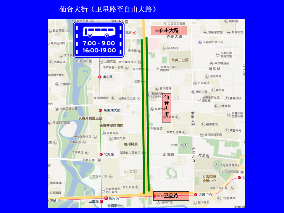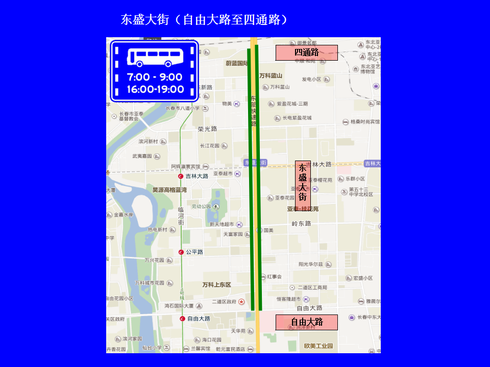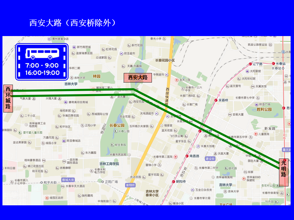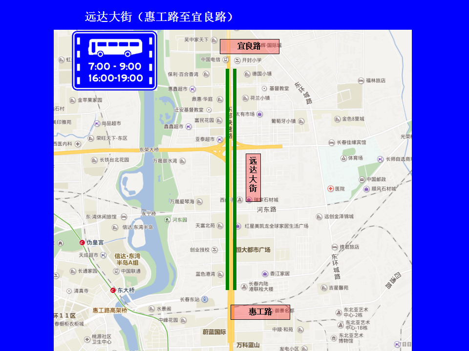 东风大街(春城大街至安庆路)、基隆街(西安广场至新月路)、柳影路(青年路至凯旋路)、西安大路(西安桥除外)、仙台大街(卫星路至自由大路)、东盛大街(自由大路至四通路)、远达大街(惠工路至宜良路)设置的公交车专用车道,除早、晚高峰(7时至9时,16时至19时)外允许其他社会车辆通行。