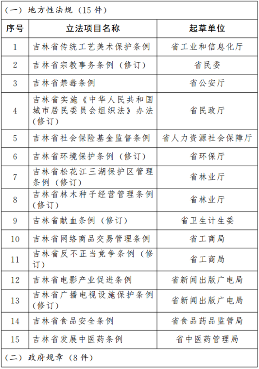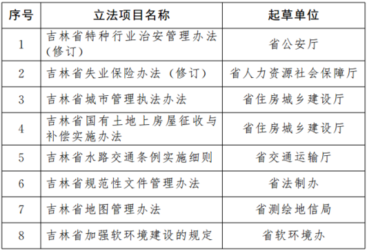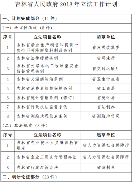 其中,《吉林省消费者权益保护条例》《吉林省艾滋病防治条例》《吉林省法律援助条例》等8件地方性法规列入2018年立法工作计划。