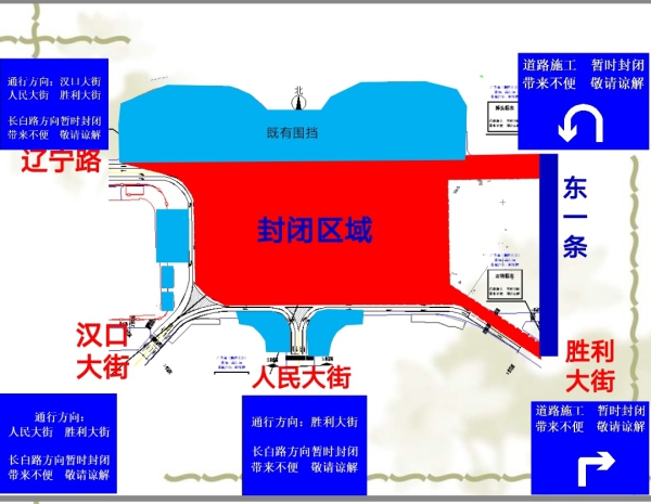 由于地铁施工原因,站前广场辽宁路至长白路东一条临时封闭,辽宁路到汉口大街,辽宁路到人民大街,辽宁路胜利大街,人民大街到胜利大街车辆可以正常通行,绕环岛车辆请提前绕行。