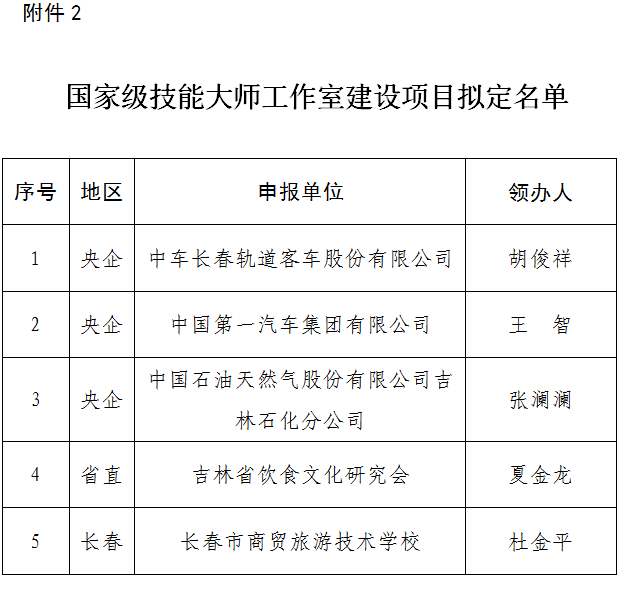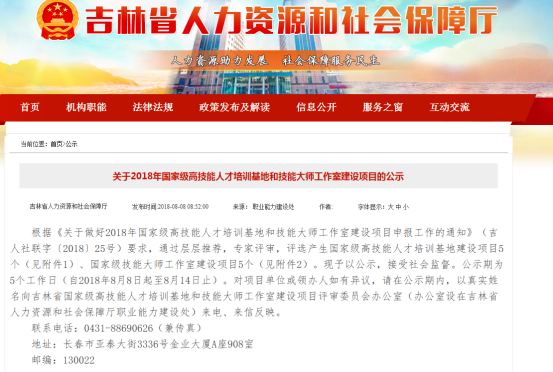 中国吉林网、吉刻APP记者在吉林省人社厅网站上获悉,根据《关于做好2018年国家级高技能人才培训基地和技能大师工作室建设项目申报工作的通知》要求,通过层层推荐,专家评审,评选产生国家级高技能人才培训基地建设项目5个(见附件1)、国家级技能大师工作室建设项目5个(见附件2)。现予以公示,接受社会监督。公示期为5个工作日(自2018年8月8日起至8月14日止)。对项目单位或领办人如有异议,请在公示期内,以真实姓名向吉林省国家级高技能人才培训基地和技能大师工作室建设项目评审委员会办公室(办公室设在吉林省人力资源和社会保障厅职业能力建设处)来电、来信反映。