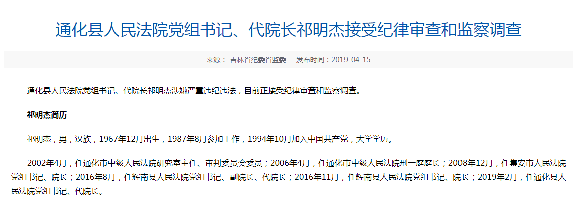 4月15日,吉林省纪委省监委官网发布消息,“通化县人民法院党组书记、代院长祁明杰涉嫌严重违纪违法,目前正接受纪律审查和监察调查。”