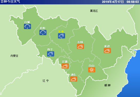 今天白天到夜间,全省多云有时阴,白城、松原、长春、辽源、吉林、通化、白山、延边、长白山保护区有小雨。 今天白天延边地区最高气温为25℃,其他大部分地区19~23℃;今天夜间白城地区最低气温为1℃左右,其他地区2~6℃,长春市今天白天最高气温:21℃,今天夜间最低气温:2℃。 白城、松原、长春、四平、辽源、吉林西部、通化北部火险气象等级为4级,其它地区火险气象等级为3级。