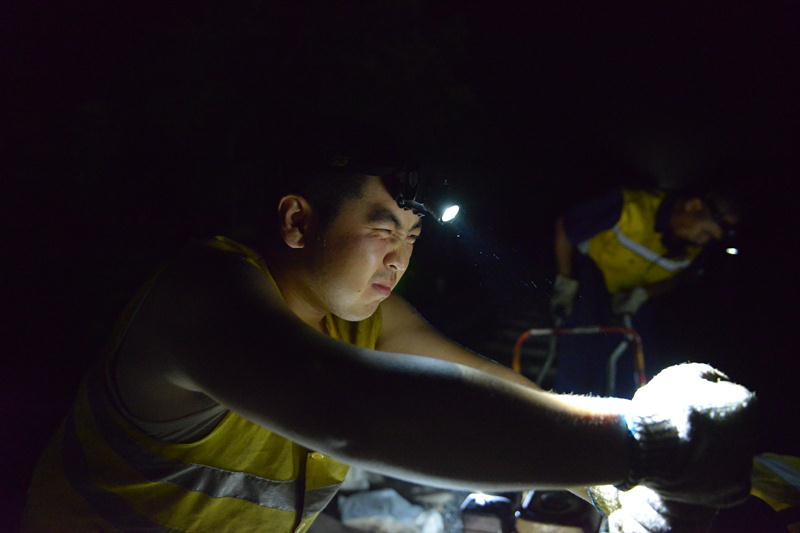 “命令以下,可以上道。”次日凌晨一点,职工们头戴头灯在漆黑的夜里奔行,雨水和汗水掺杂一起浸湿作业服,不时的,他们脱下作业服拧出水分,在进行作业。蚊虫围绕闪亮的头灯,不停地叮扰着每位作业的职工,面对诸多困难,“黄马甲”们完全没有顾及,都在快速撤除垫板向前行进,为大机捣固车精准捣固、夯实线路基础提供保障。