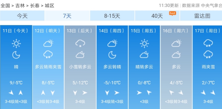 中国天气网11月11日7时发布未来三天全省天气预报。今天白天到夜间,全省多云有时晴,白山东部、长白山保护区有雨夹雪。 明天白天到夜间,全省多云,辽源、吉林西部有雨夹雪转小到中雪,白城北部、长春、四平东部、吉林东部、通化、白山、延边西部、长白山保护区有雨夹雪。 今天白天全省大部分地区最高气温为7℃~10℃;今天夜间全省大部分地区最低气温为-7℃~-4℃,长春市今天白天最高气温为9℃,今天夜间最低气温为5℃。 预计今天白天到夜间,全省大部分地区有3级左右西北风。 白城、松原、通化、白山、延边、长白山保护区火险气象等级为3级,其他地区火险气象等级为2级。