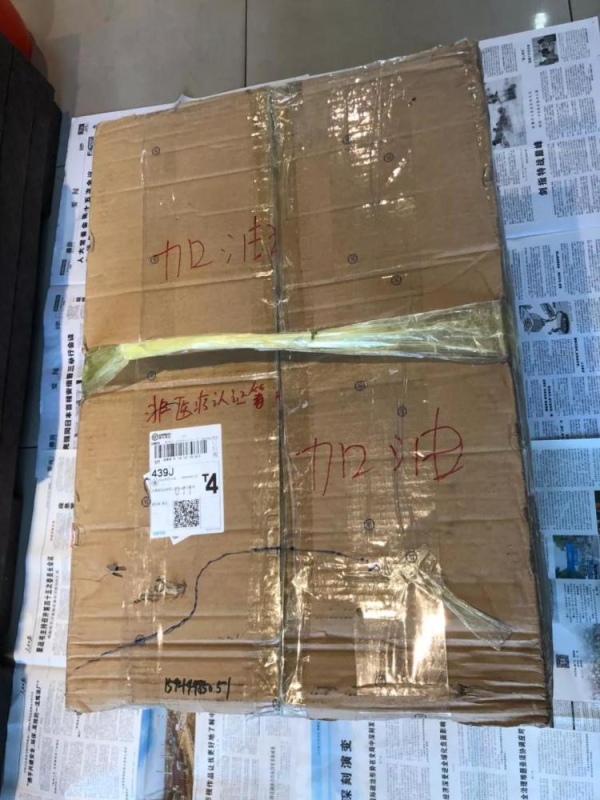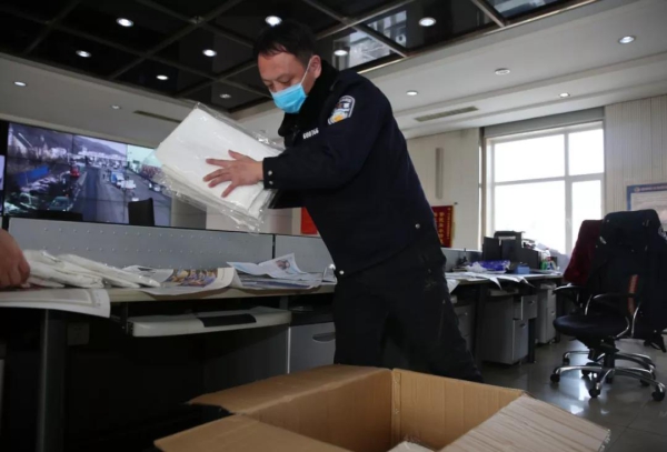 指挥中心民警很快将快递箱取回了指挥大厅。值班民警七嘴八舌地上前围观,只见箱子外用红色油性笔写着“加油”,没有寄件人信息,箱子拆开后,里面是一个个白色的、雨衣样的物品:是防护服,一共40件。