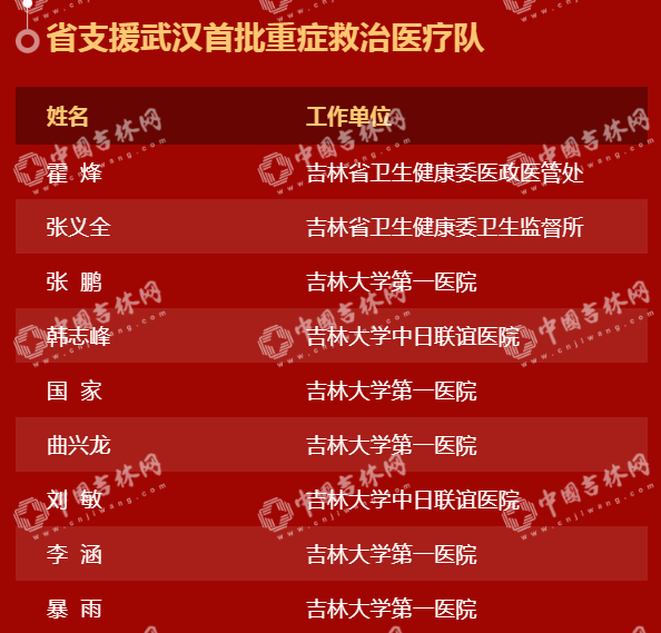 2月4日,吉林大学第一医院国家紧急医学救援队从长春出发,救援队由医院重症监护室、呼吸科、急诊科、检验科、胃肠内科、放射线科、第一手术室、神经创伤及整形修复、神经外科ICU、肝胆胰外科、心血管疾病诊治中心、后勤管理部等科室部门的32名医生、护士、医技和后勤人员组成。