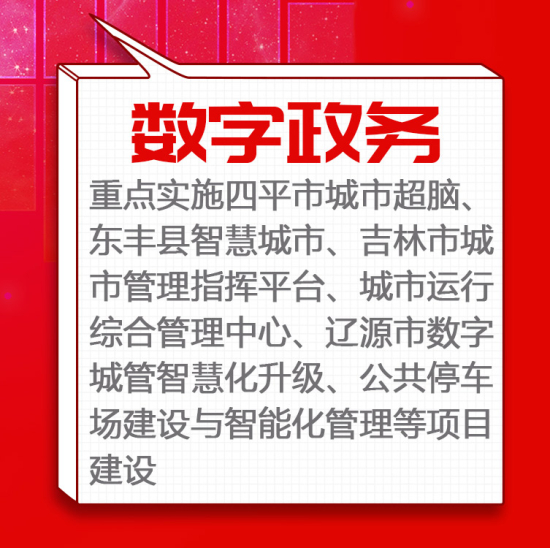 重点实施四平市城市超脑、东丰县智慧城市、吉林市城市管理指挥平台、城市运行综合管理中心、辽源市数字城管智慧化升级、公共停车场建设与智能化管理等项目建设。