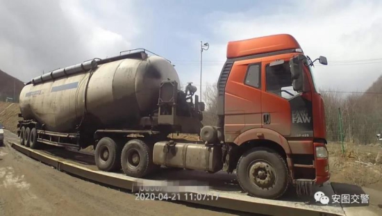 4月21日,延边交警支队安图大队民警在安二线-—98公里巡逻执勤时,一辆牵引挂车中装满了粉煤灰的重型半挂牵引车,引起了民警的怀疑。民警立即将该车拦停在路边,并引导该车辆进行了称重。经称重,该车核载量为26吨,实际载货量加车重为103吨,超过核载量的200%。