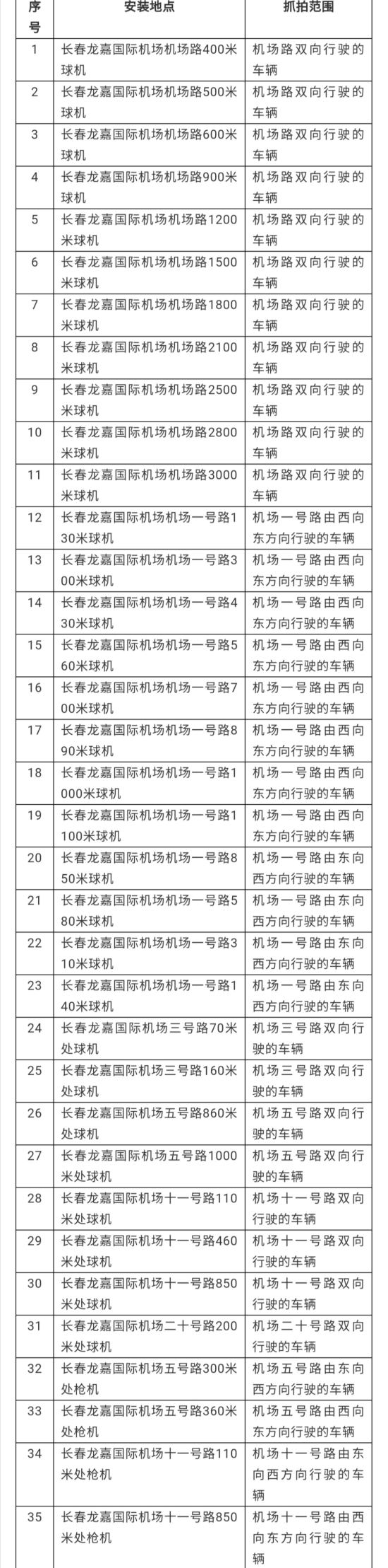 5月22日,中国吉林网从吉林省公安厅机场公安局交通警察支队获悉,为加强道路交通管理,减少道路交通违法行为,规范路口行车及停车秩序,营造安全畅通的道路交通环境,长春龙嘉国际机场新增35处电子警察设备,现已建设完成,主要抓拍不按规定停车、压线行驶、不按导向车道行驶、逆向行驶、驾驶时使用手持电话、吸烟、不系安全带等交通违法行为。现对具体安装路口公示如下: