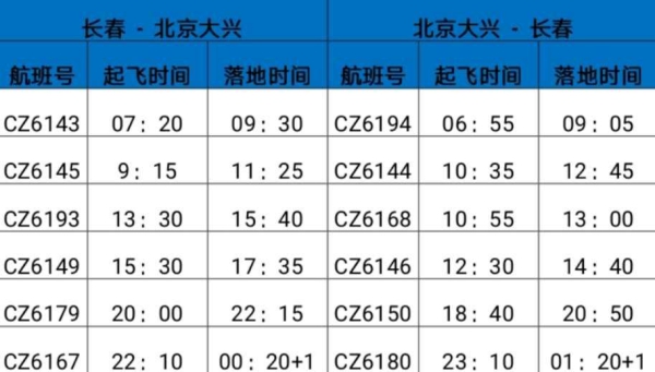 长春往返北京大兴航班时刻:
