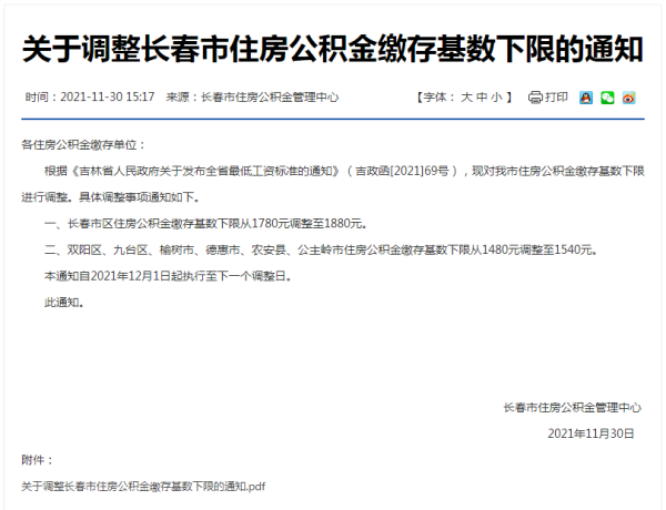 中国吉林网从长春市住房公积金管理中心获悉,从2021年12月1日起,长春市住房公积金缴存基数下限调整!