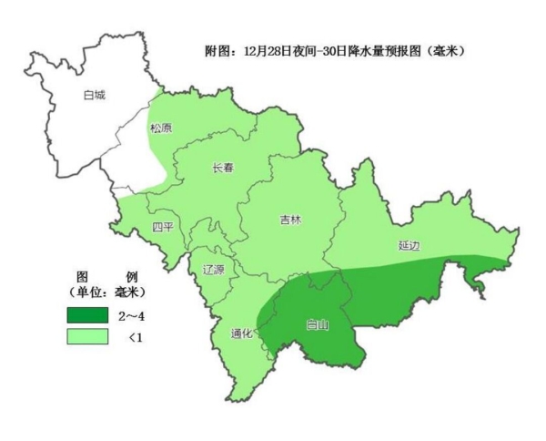 过程降雪量:白山、延边地区南部、长白山保护区降雪量为2~4毫米,新增积雪深度为3厘米左右;白城、松原南部基本无降雪;其他地区降雪量一般不足1毫米,新增积雪深度不足1厘米。