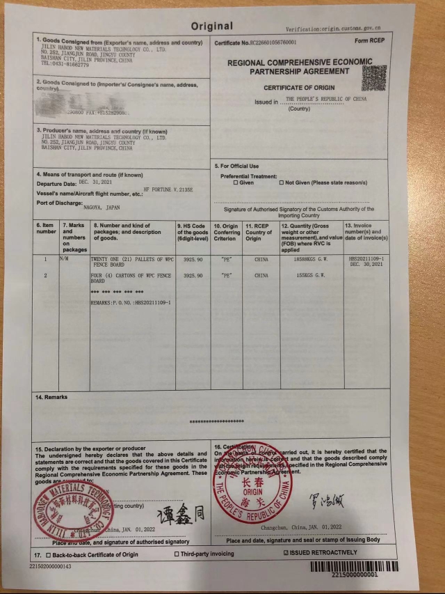 2022年1月1日,长春海关所属长春兴隆海关为辖区企业吉林华邦新材料科技有限公司出口至日本的塑料围栏板签发RCEP原产地证书,货值33500美元。这是《区域全面经济伙伴关系协定》(RCEP)正式生效后,长春关区签发的首份RCEP原产地证书。
