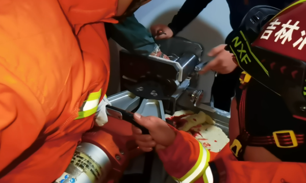 带队负责人徐延毅首先对压面机结构和伤者伤着部位进行了解,随后制定救援方案,先用无齿锯对滚轴抽心点进行切割,再利用液压扩张器对卷压部位进行扩张,同时对伤着部位周边进行支撑加固,预防金属回弹二次伤害。在破拆营救的过程中,为防止受伤人员产生情绪波动,消防救援人员通过安抚伤者,使伤者的情绪稳定。