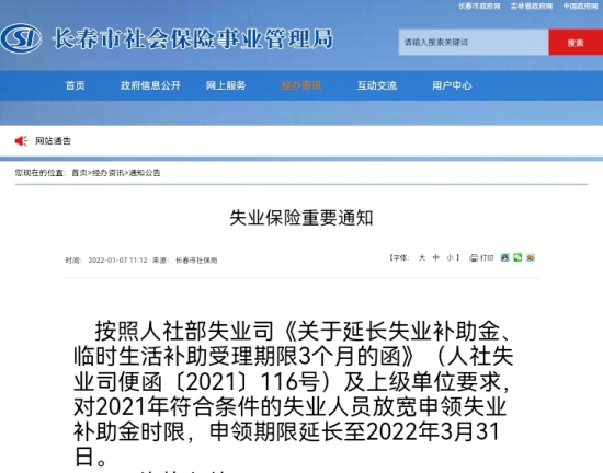 7日,中国吉林网从长春市社会保险事业管理局了解到,按照人社部失业司《关于延长失业补助金、临时生活补助受理期限3个月的函》(人社失业司便函〔2021〕116号)及上级单位要求, 对2021年符合条件的失业人员放宽申领失业补助金时限,申领期限延长至2022年3月31日。