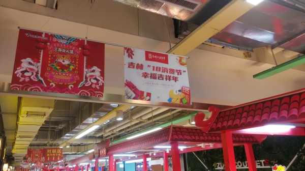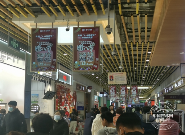无独有偶,在位于宽城区的中东港商场内,年货大集一派繁忙的热闹景象。喜庆的大红灯笼、春联年画、糖酒副食等诸多商品应有尽有,吸引消费者前往购买。