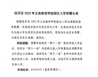 中国吉林网从长春经济技术开发区文教局了解到,1月7日,根据经开区2022年义务教育学校招生入学生源摸底排查数据,长春经济技术开发区世纪小学、长春经济技术开发区北海小学出现学位供给紧张情况,向社会发出预警。
