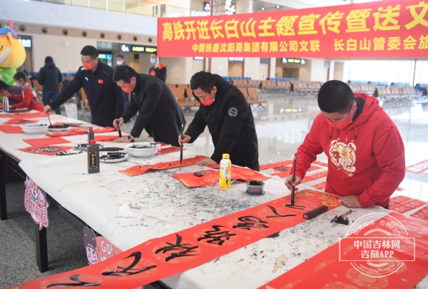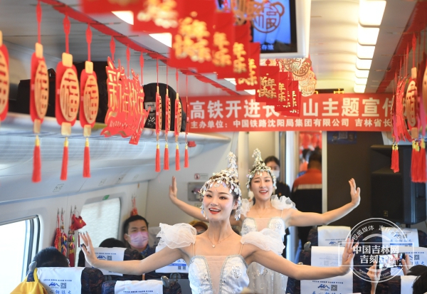 歌舞表演、写赠春联福字……当日,在沈阳开往长白山的D8083次列车上,沈阳局集团公司还策划组织了“冬奥在北京、体验在吉林”主题文艺活动,在农历小年到来之际,为乘车旅客带来别样的春运体验。