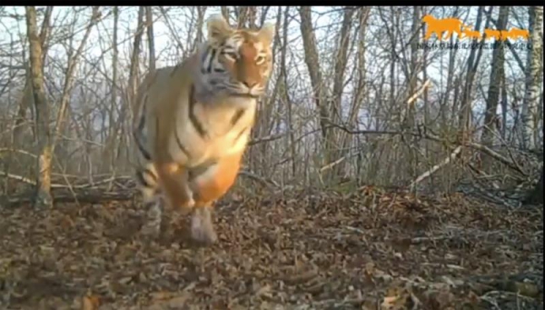 2021年4月26日,架设在吉林珲春的红外相机拍摄下这样一段视频:一群梅花鹿仓皇逃窜。身后,一只野生东北虎威风凛凛地追逐而来,从林间的枯树落叶间腾跃而过。晨曦照耀着它的皮毛,森林王者笼罩着金色的光芒。