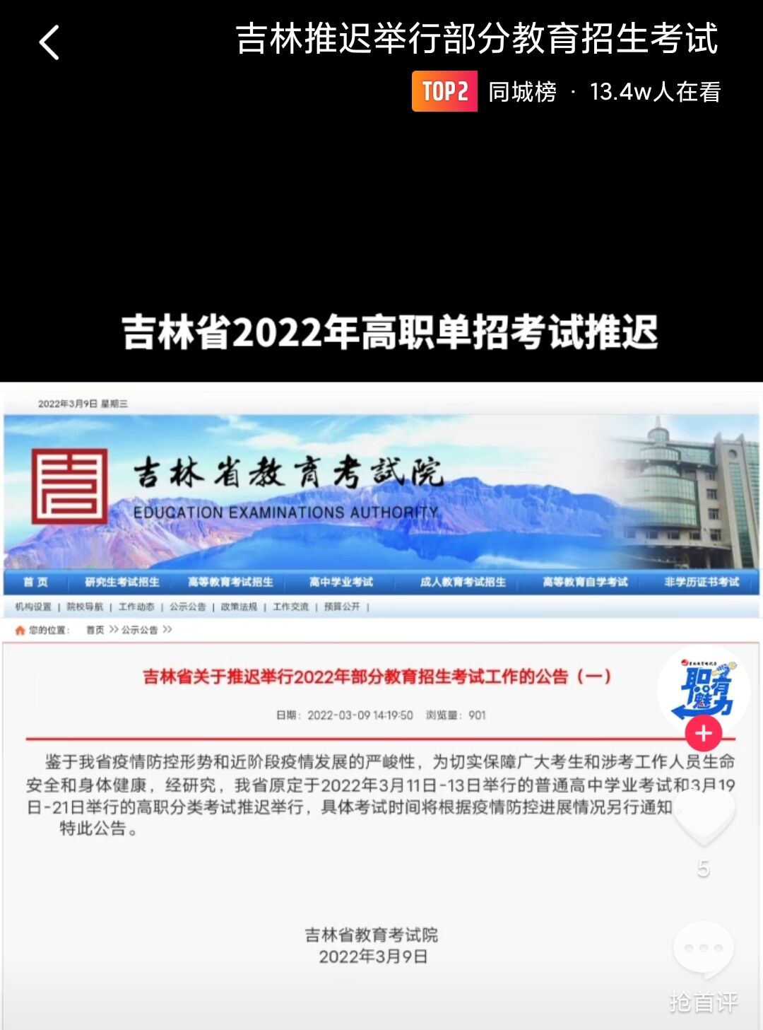 鉴于吉林省疫情防控形势和近阶段疫情发展的严峻性,为切实保障广大考生和涉考工作人员生命安全和身体健康,经研究,原定于2022年3月11日-13日举行的普通高中学业考试和3月19日-21日举行的高职分类考试推迟举行。
