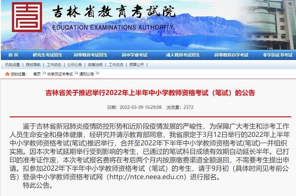 此外,吉林省原定于3月12日举行的2022年上半年中小学教师资格考试(笔试)推迟举行,合并至2022年下半年中小学教师资格考试(笔试)一并组织实施。因本次考试延期举行受到影响的考生,已通过的笔试科目成绩有效期自动延长半年。已打印的准考证作废,本次考试报名费将在考后两个月内按原缴费渠道全额退回,不需要考生提出申请。拟参加2022年下半年中小学教师资格考试(笔试)的考生,请于9月初(具体时间见考前公告)登录中小学教师资格考试网(http://ntce.neea.edu.cn)进行报名。
