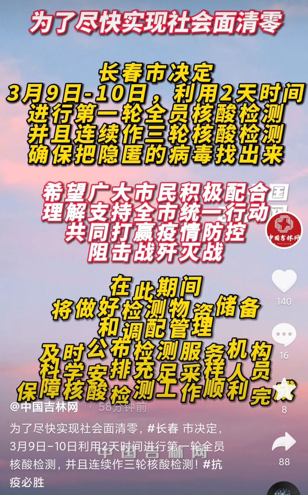 3月9日-10日,长春市将利用2天时间进行第一轮全员核酸检测,并且连续作三轮核酸检测,确保把隐匿的病毒找出来。