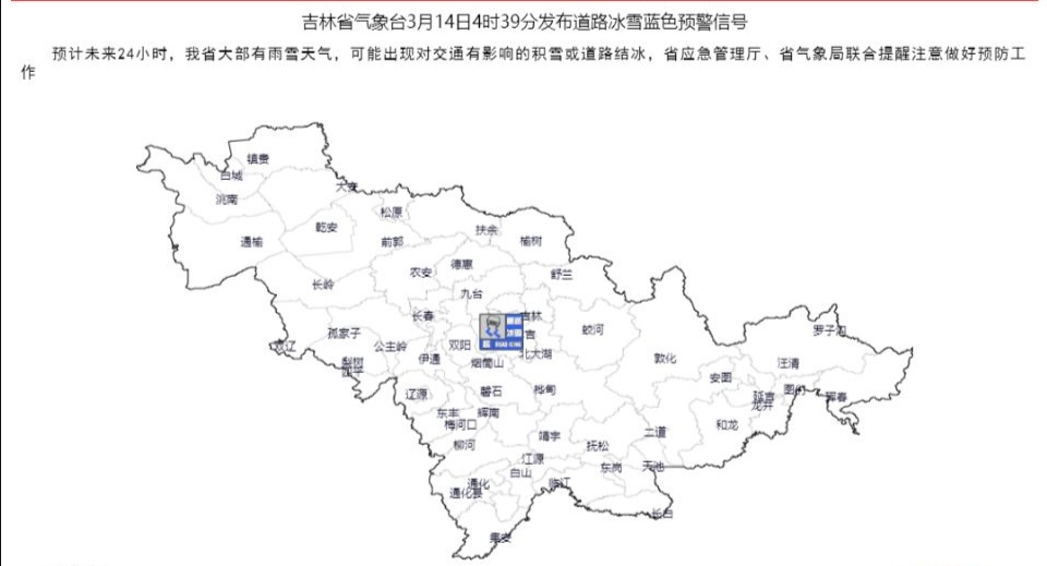 吉林省气象台3月14日4时39分发布道路冰雪蓝色预警信号:预计未来24小时,我省大部有雨雪天气,可能出现对交通有影响的积雪或道路结冰,省应急管理厅、省气象局联合提醒注意做好预防工作。