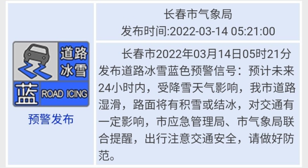 长春市2022年03月14日05时21分发布道路冰雪蓝色预警信号:预计未来24小时内,受降雪天气影响,长春市道路湿滑,路面将有积雪或结冰,对交通有一定影响,市应急管理局、市气象局联合提醒,出行注意交通安全,请做好防范。