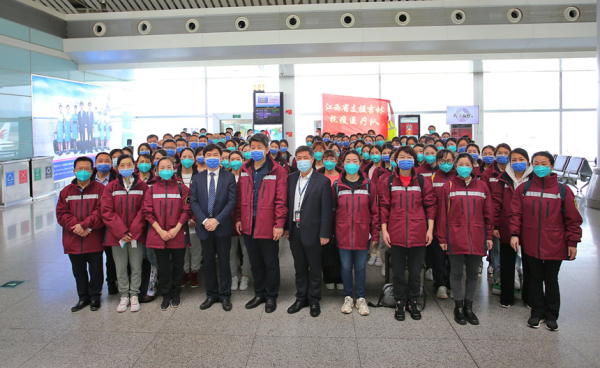 14日,江西航空RY8881南昌-长春航班从南昌昌北机场起飞,护送江西省首批驰援吉林医疗队。本次航班满载着104名医护人员,装运行李等物资3417公斤。经过3小时,飞机安全降落在长春龙嘉机场,将医护人员平安送抵吉林。