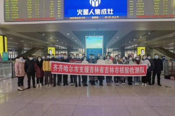 3月10日早7时许,在齐齐哈尔火车站南站候车大厅内, 20名支援吉林市的核酸检测人员整装待发。带着鹤城人民嘱托支援吉林,与吉林人民一道共克时艰,共战疫情。